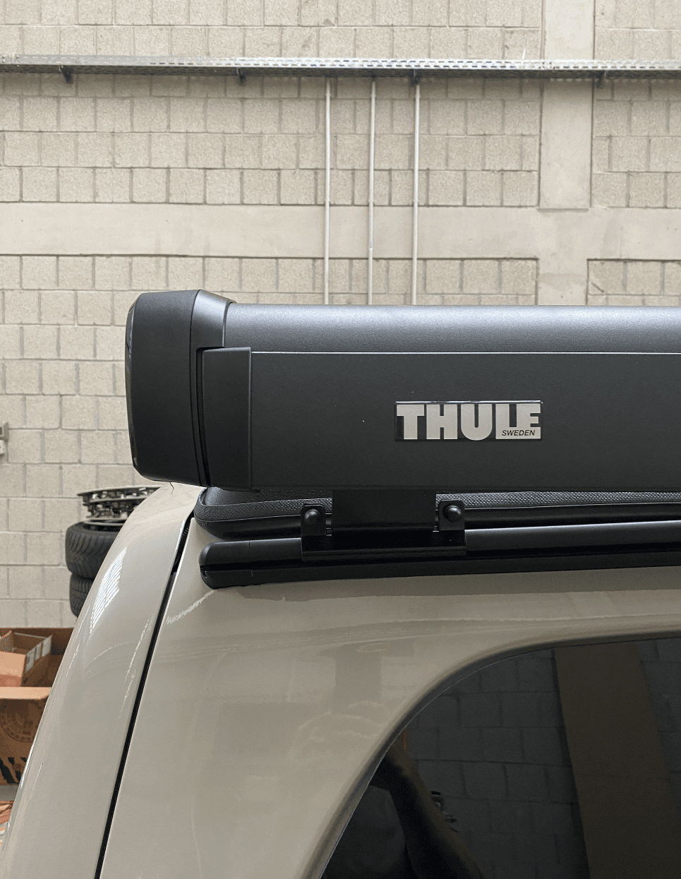 Eine Thule Omnistor 4200 Markise mit 260 Zentimeter Länge wurde mit Adapterhaltern am Multirail und Dach befestigt.